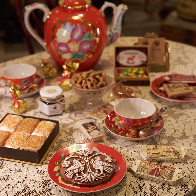 За чашкой чая со сладостями 8–10 видов вы узнаете историю русских сладостей, традиционного искусства или историю праздников. Чаепития проходят в галерее Сиринъ, проводятся под заказ, количество участников от 2-х человек, в утренние и вечерние часы.